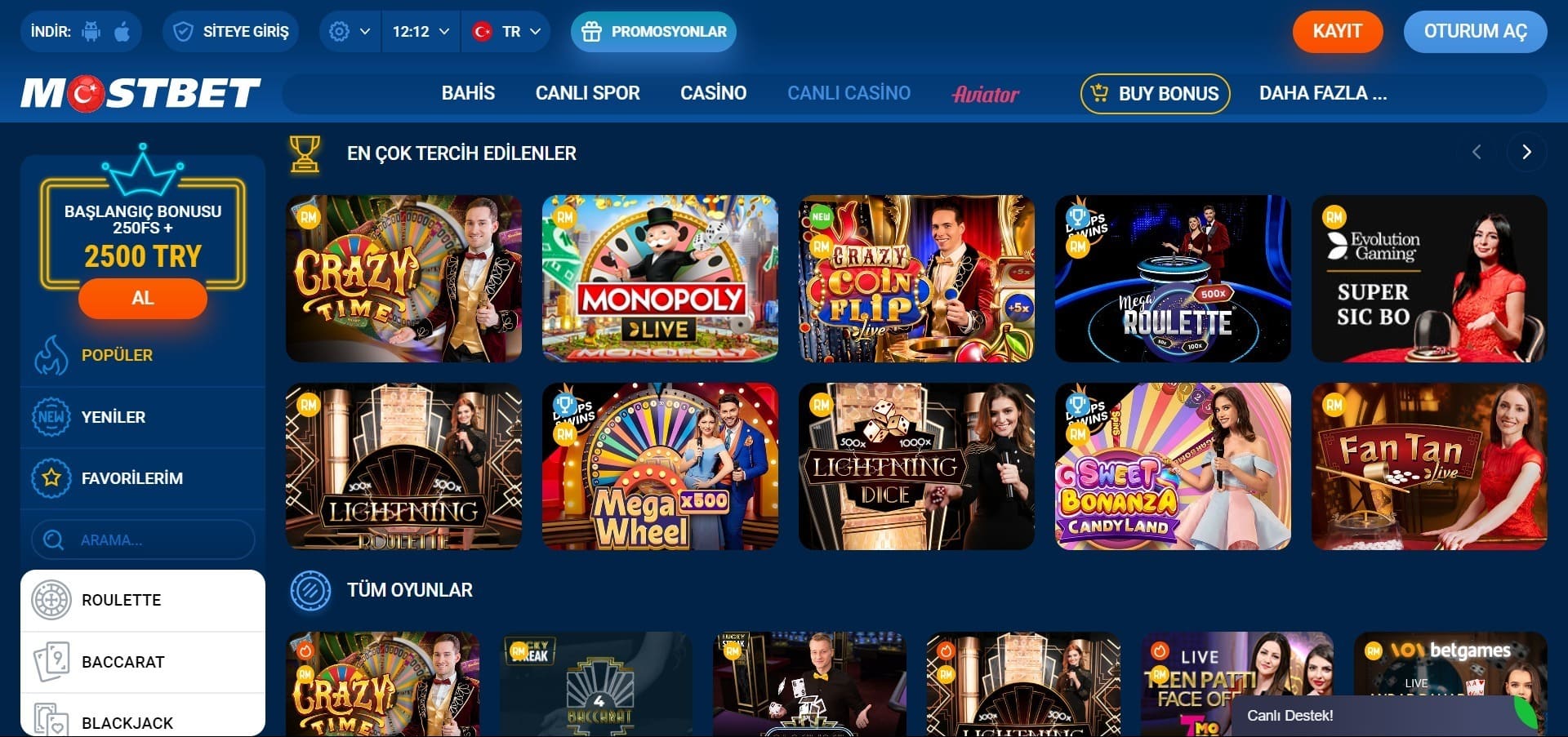- Kazino o’yinlari: Sport tikishlaridan tashqari, Mostbet shuningdek, kazino o’yinlarining keng tanloviga ega. Bularga mashhur slotlar, onlayn poker, blackjack va ruletka kabi stol o’yinlari, shuningdek, uyda o’tirmasdan kazino saytida immersiv tajribani taqdim etadigan onlayn dilerlik o’yinlari kiradi.