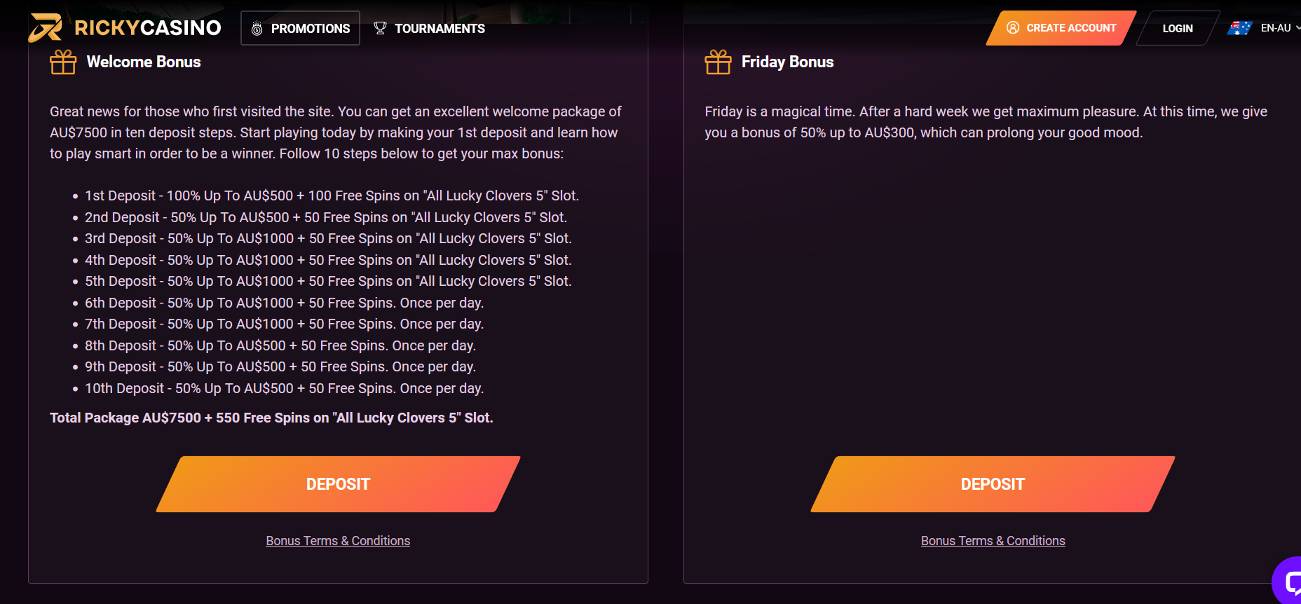 Ricky Casino sorgt dafür, dass australische Spieler jederzeit Zugriff auf Vorteile und Aktionen haben. Es erwarten Sie regelmäßig Bonusangebote – von täglichen Belohnungen über wöchentliche Boni bis hin zu Geburtstagsboni. Wir stellen Ihnen einige der bemerkenswertesten Boni und Aktionen vor, die auf der Ricky Casino-Website verfügbar sind.